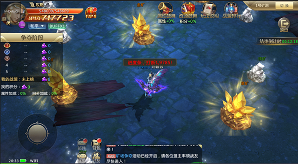 1分钟内争夺金矿,金矿每失去12.5%的血量,随机发放一次积分奖励,优先击杀其他公会玩家,确保奖励归属于本公会!