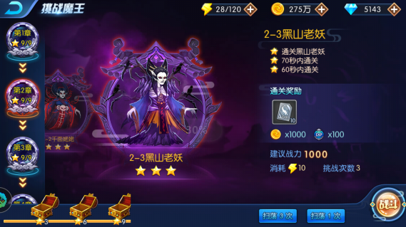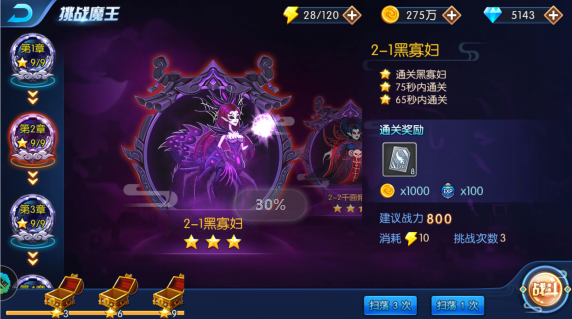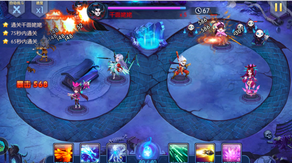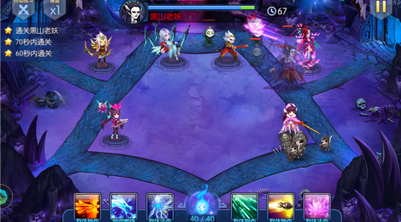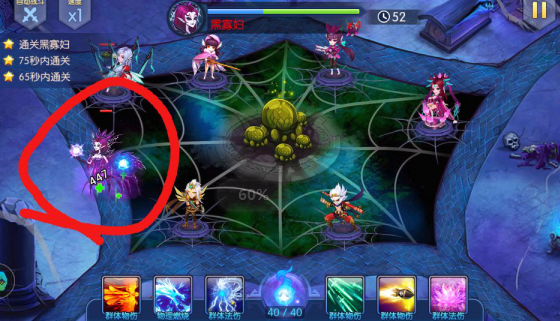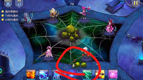 中间位置出怪,怪同时向两边出,boss向左边走,技能是召唤蝙蝠。中间位置是主C位,适当释放技能就能三星。