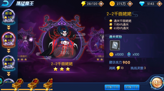 中间,左下,右下都是出怪的地方,中间是boss出生的位置,会释放隐身,周围范围都能隐身,隐身的时候无法攻击,只能用技能攻击隐身,然后输出,第二章的三小关的三星都不困难,没什么技巧,多试试就能三星通关了。