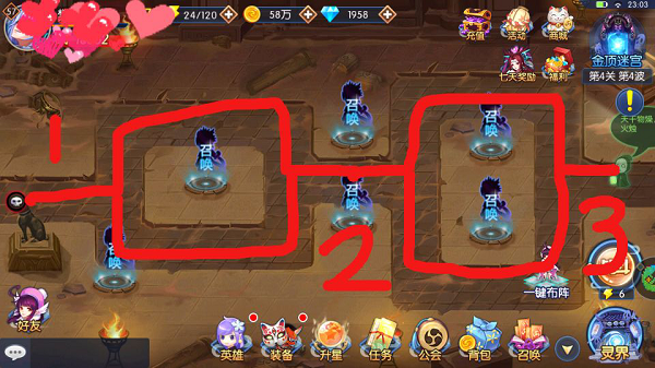 一、地图分析:如上图所示,地图中怪物的行动路线为倒葫芦型,1号位置出怪,2号位置为狭小狩猎,3号位置清残血怪的位置。1号位置虽然狭小但是英雄位置不好。最多2个位置同时攻击。2号位置可同时受5个攻击位辐射,是我们理想的输出位置。3号位置为点杀清兵位置。