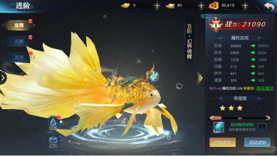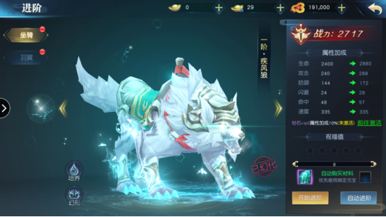 坐骑系统和羽翼系统是相通的,这里主讲一下坐骑系统。坐骑可以消耗坐骑进阶石升星,升阶石头来自于坐骑副本和主线副本。若升星失败则增加祝福值,祝福值越高下一次升星成功率也就越高。进阶成功后坐骑将会升一颗星,升到5星后可以进阶,进阶后坐骑会解锁新外观。