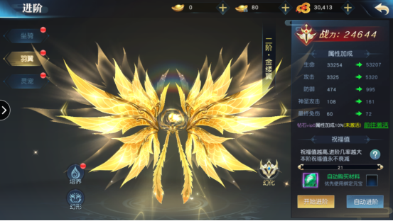 翅膀和坐骑不同的是升阶后提升基础属性和神圣攻击和最终免伤。神圣攻击即为无视防御的伤害,最终免伤即为最终结算时的伤害减免。例如当对方攻击为1000,我方防御为500,减伤率为50%,最终伤害减免为100时,收到的伤害为
