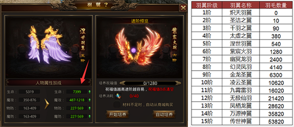 选择完元神后继续一步步跟着主线任务走,到达《羽翼》系统。这也是传奇里面很重要的一项全面提升自身属性的羽翼系统,每阶段的羽翼会很强大的提升角色属性而且羽翼特色炫酷华丽。