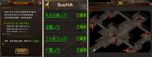 在完成之前任务之后,相信各位战士们也准备到达(试炼之地),在那里面有丰富的BOSS,适合你等级的游戏装备,当前阶段角色装备都可以在(试炼之地)的BOSS之获得,让你觉得装备更加华丽属性加倍提升。