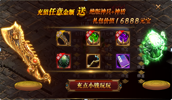 首冲礼包赠送的装备超级豪华,能获得价值16888元宝的装备,赠送礼物超级多,让你打怪更快防御更高升级更快。(赠送礼品有以下)