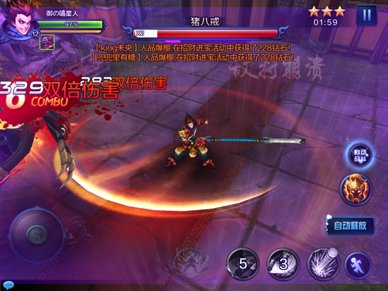 双刀轻盈攻击较高,技能效果带有突进但是自身防御较弱,推荐战力完全碾压对手时使用。若对手一味逃跑,那么马上切换双刀近身追击,攻击特效自带突进。动作手游诠释什么才是极限走A!