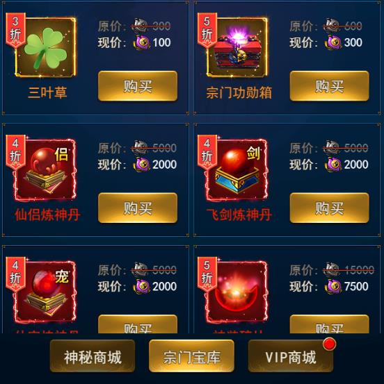 这个就是凡人飞仙传的宗门宝库玩法的界面了,可以看到宗门商店中有着三叶草、功勋箱、以及各种炼神丹还有神装碎片。购买时需要消耗宗门勋章。喜欢的东西想换就去换吧。