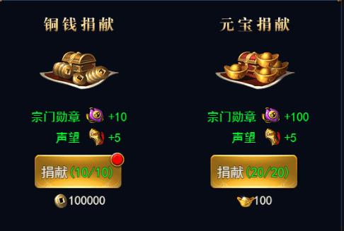宗门勋章的来源是铜钱捐献和元宝捐献两种。消耗的与获得的勋章也不太一样。