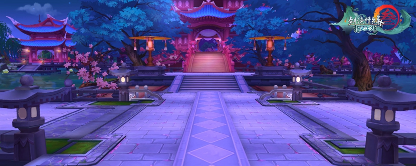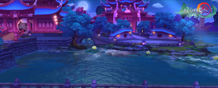 入夜之后,华灯初上的七秀坊比之昼间风光,少了几许喧闹,添了几分柔和。月亮的清辉与点点灯光在回廊中投下一片片花枝树蔓的剪影,恰似七秀弟子们舞蹈时曼妙的身影,充满了写意的魅力。