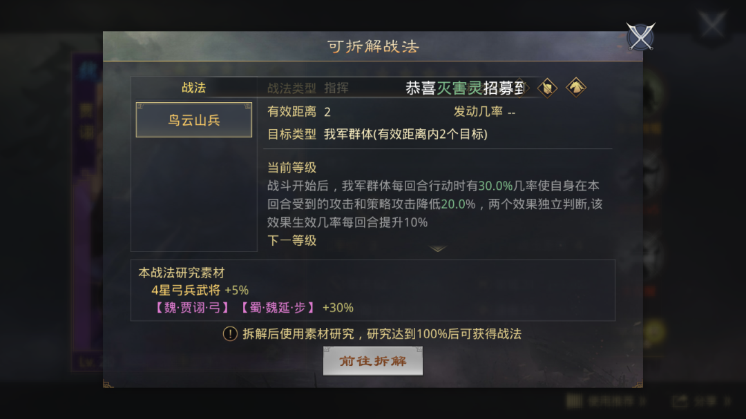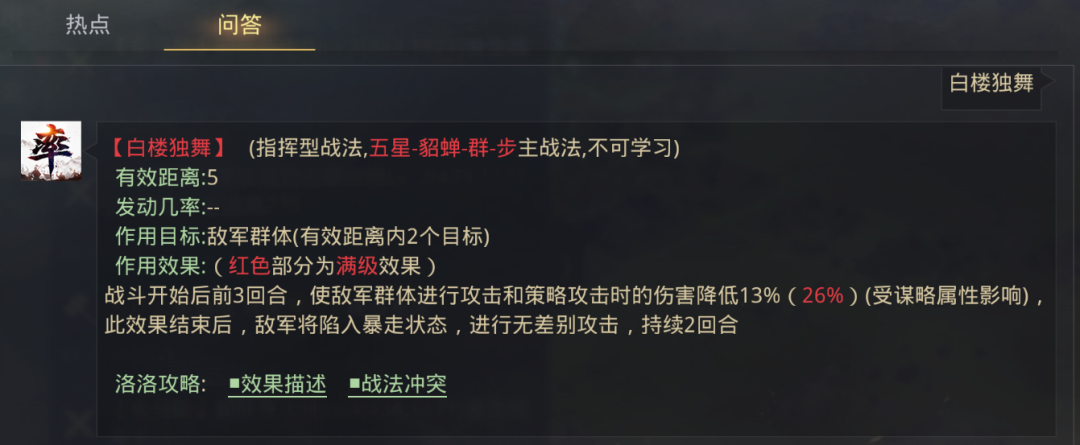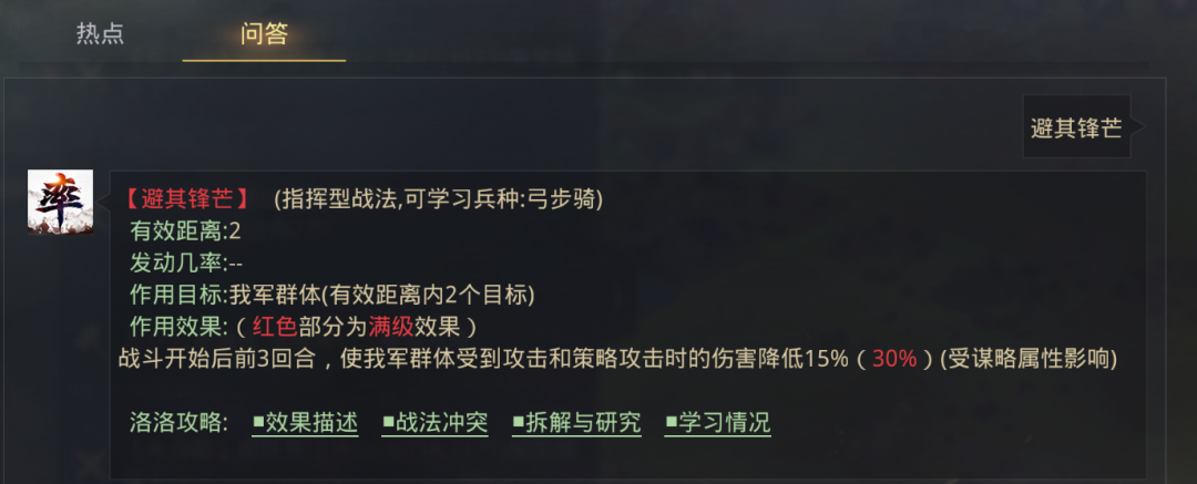 在这里笔者需要提醒玩家,鸟云山兵与避其锋芒存在一定的冲突,但这种冲突是“豪华型选择”的结果,与“垒实+健卒”两个豪华型五星战法最大化保障前锋生存能力的选择是类似的,避其锋芒与鸟云山兵的搭配会让队伍在前三回合享受避其锋芒的高额减伤。